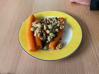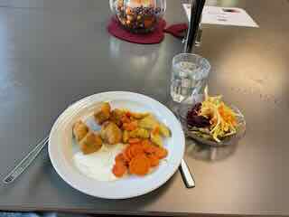 Zu Mittag im Café Balm ass ich einen gemischten Menüsalat und danach 5 Chicken-Nuggets mit Country-Fries und Karotten.