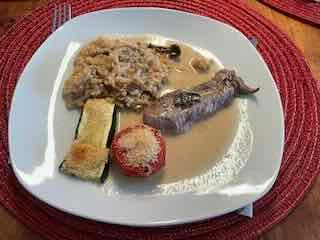 Einem gemischten Salat zur Vorspeise und zur Hauptspeise Saltimbocca mit Pilzrisotto und Tomaten und Zucchetti aus dem Backofen. 😋