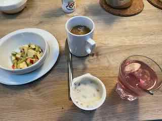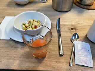 Zum Frühstück hatte ein Fruchtsalat mit Joghurt, ein Papayasaft und ein Kaffe.