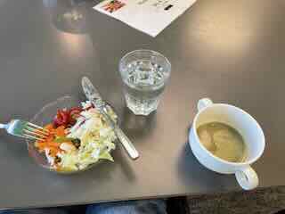 Zu Mittag im Café Balm hatte ich einen gemischten Menüsalat eine halbe Linsenpürre-Suppe.