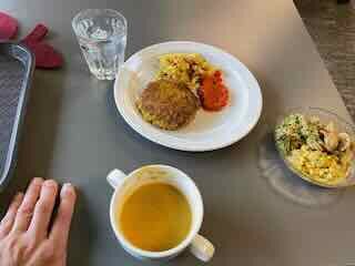Zu Mittag hatte ich im Café Balm einen gemischten Menüsalat zur Vorspeise, danach eine halbe Gemüsepüree-Suppe und zur Hauptspeise ein Vegetarischer Bratling an Ajvar mit Mediterranem-Couscous.