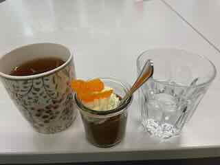 In der Pause trank ich Tee und ein Glas Wasser, dazu ass ich den den Dessert vom Mittag.
