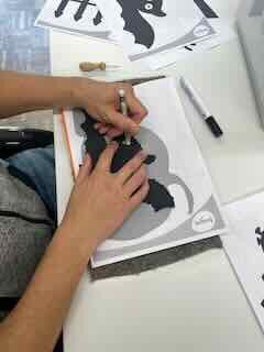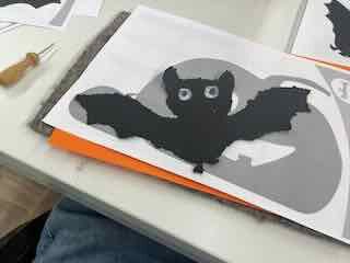 Auf dem Beitragsbild sieht man mich Halloween-Fensterdekoration fürs Atelier im Wohnheim Balm stüpferlen.
