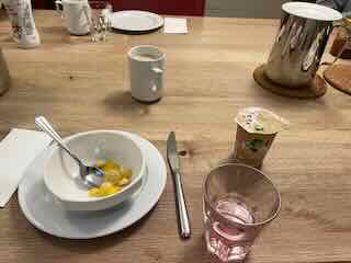 Am Morgen frühstückte ich ein Fruchtsalat mit Joghurt.