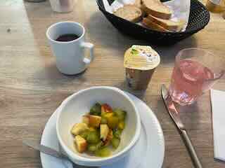 Zum Frühstück im Riva hatte ich ein Fruchtsalat mit Stracciatella-Joghurt und die üblichen Getränke.