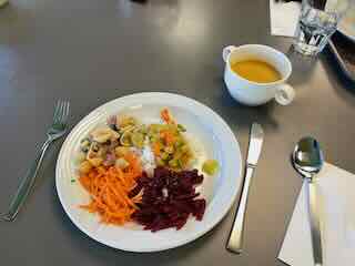 Zuerst eine halbe Kürbiscreme-Suppe, danach Gemüsecurry mit Kichererbsen und Randen-Karottensalat.