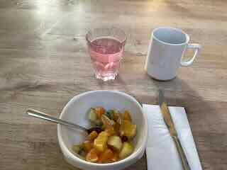 Zum Frühstück ass ich ein Fruchtsalat und die trank die üblichen Getränke.