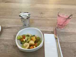 Zum Frühstück hatte ich wie immer ein Fruchtsasalat mit Joghurt.