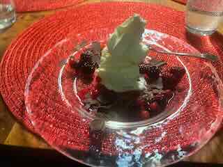 Zur Feier des Tages gab’s auch ein Dessert, nämlich eine Kugel Vanille-Glacé mit warmen Beeren und Sahne.