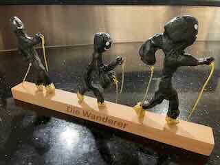 Er montierte die Wanderer von Joe und mir auf eine Leiste und gravierte mit einem Laser den Schriftzug ein.
