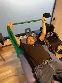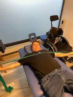 Ich machte Krafttraining mit grünen Theraband auf der Liege.