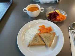 Zu Mittag im Café Balm ass ich eine halbe Tomatencreme-Suppe, ein gemischter Menüsalat und zwei Gemüsesamosas mit Joghurt-Minzdip und Karotten mit Rosmarien.