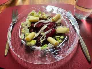 Rohe Randen mit Käse, Zwiebeln und Salat.