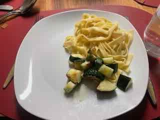 Schwinzfillet aus dem Ofen mit Zughetti und Bandnudeln.