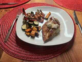 als Hauptspeise Pouletfilet mit Ofengemüse,