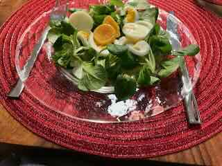 Zu Abend ass ich am Oberer Gubel zur Vorspeise Nüsslisalat mit Ei und zur Haupspeise Bratwurst mit Rösti.