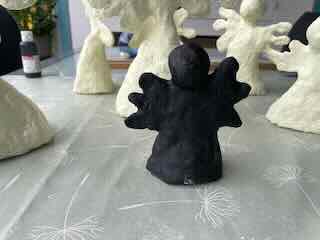 Danach machte ich noch auf den keinen schwarzen Pappmaché-Engel ein Gesicht, es war fraglich ob das gut wird?