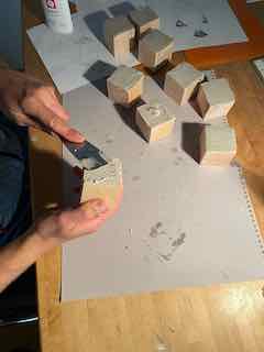 Um 19.00 Uhr schleif ich noch die frisch gespachtelten Holzwürfel.