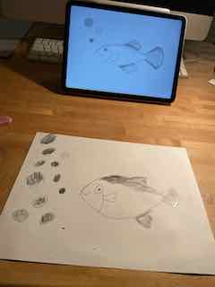 Als die Spachtelarbeit war zeichnete ich noch am Fisch weiter, mit Anleitung, vom i-Pad.