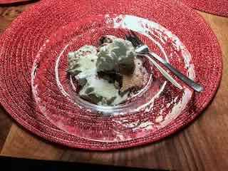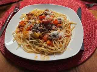 Es gab Spaghetti zur Vorspeise einen Capresé-Salat zur Vorspeise, danach Spaghetti und zum Dessert ein Vermicelles.