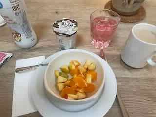 Zum Frühstück hatte ich ein Fruchtsalat mit Stracciatella-Joghurt.