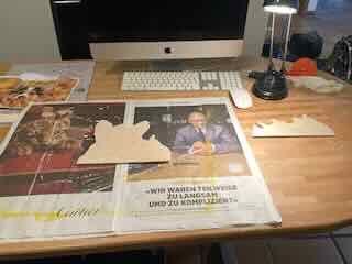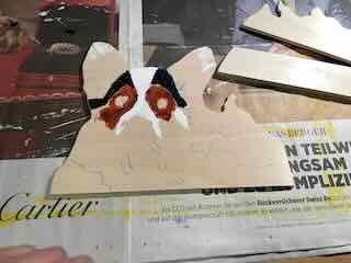 Danach sägte ich den mit Durchschlagpapier auf eine Sperrholzplatte übertragenen Hund aus.