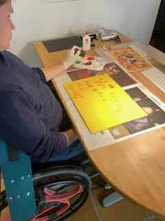 Begonnen habe ich mit dem Hintergrund, eine Holzplatte gelb mit einem Pinsel bemalen und danach braun mit einem Schwamm betupfen.