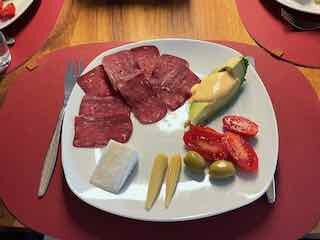 Zu Abend ass ich einen Teller mit Bündnerfleisch, Avocado und Gemüse.