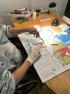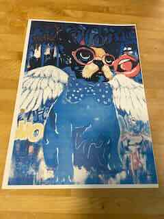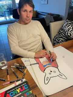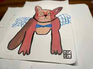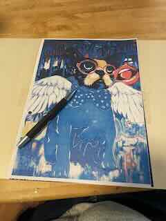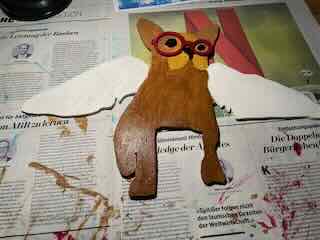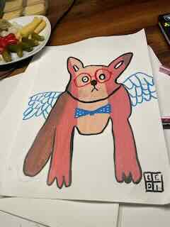Anschliessend machte ich eine Weihnachtszeichnung von einem Engel-Hündchen mit Flügel hinausstechender, roter Brille.