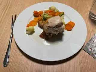 Zu Abend ass ich Poulet mit Ofengemüse.