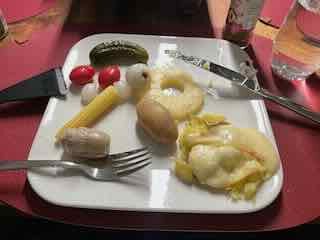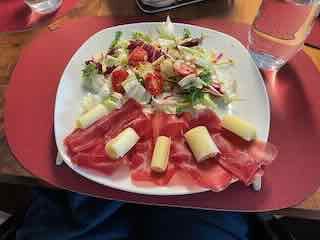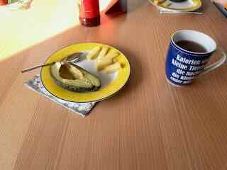 Bei Ivo an der Kanalstrasse ass ich eine halbe Avocado mit Käse zu Mittag und trank einen Tee.