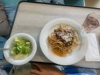 Spaghetti Bolo mit Salat.