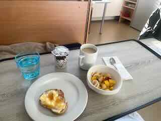 Zum Frühstück hatte ich das Übliche unter der Woche, weil ich mein Gesäss schonen muss im Bett.