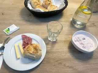 Zu Abend hatte ich ein Pürli mit Salami und Käse zur Hauptspeise und ein Birchermüsli zum Dessert.